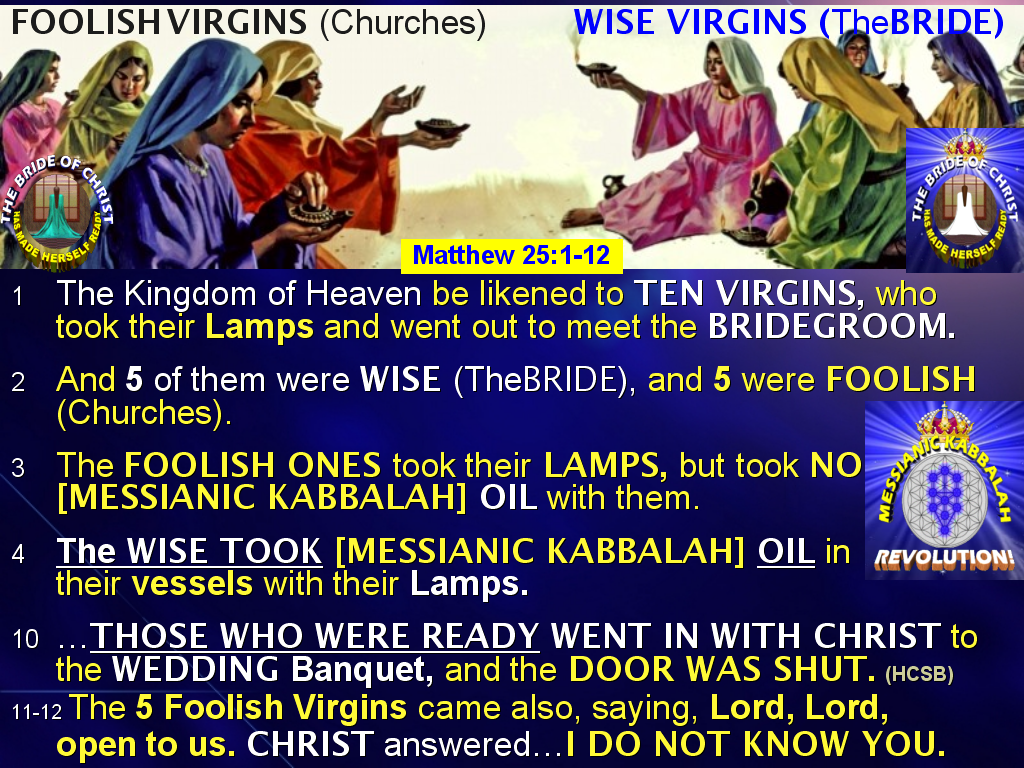 To make it more Biblically clear: The Faithful BRIDE OF CHRIST has the OIL of God's MESSIANIC KABBALAH WISDOM from Heaven, making them WISE VIRGINS (Revelation 19:7-8).